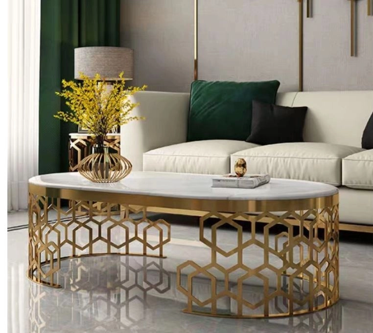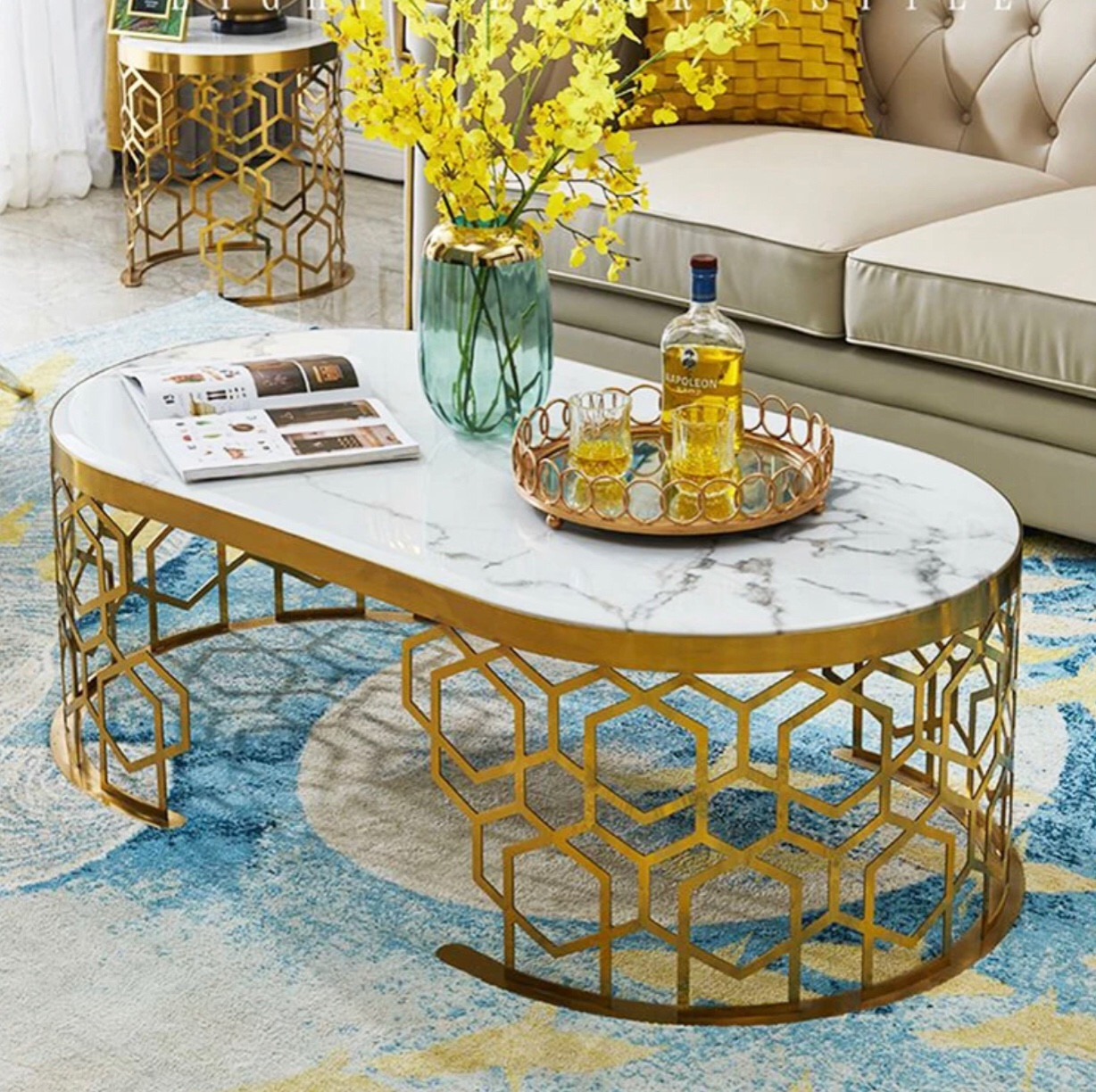 Khung chân bàn: Inox 201 mạ vàng sáng bóng, chống gỉ sét, tạo hình họa tiết lục giác hiện đại